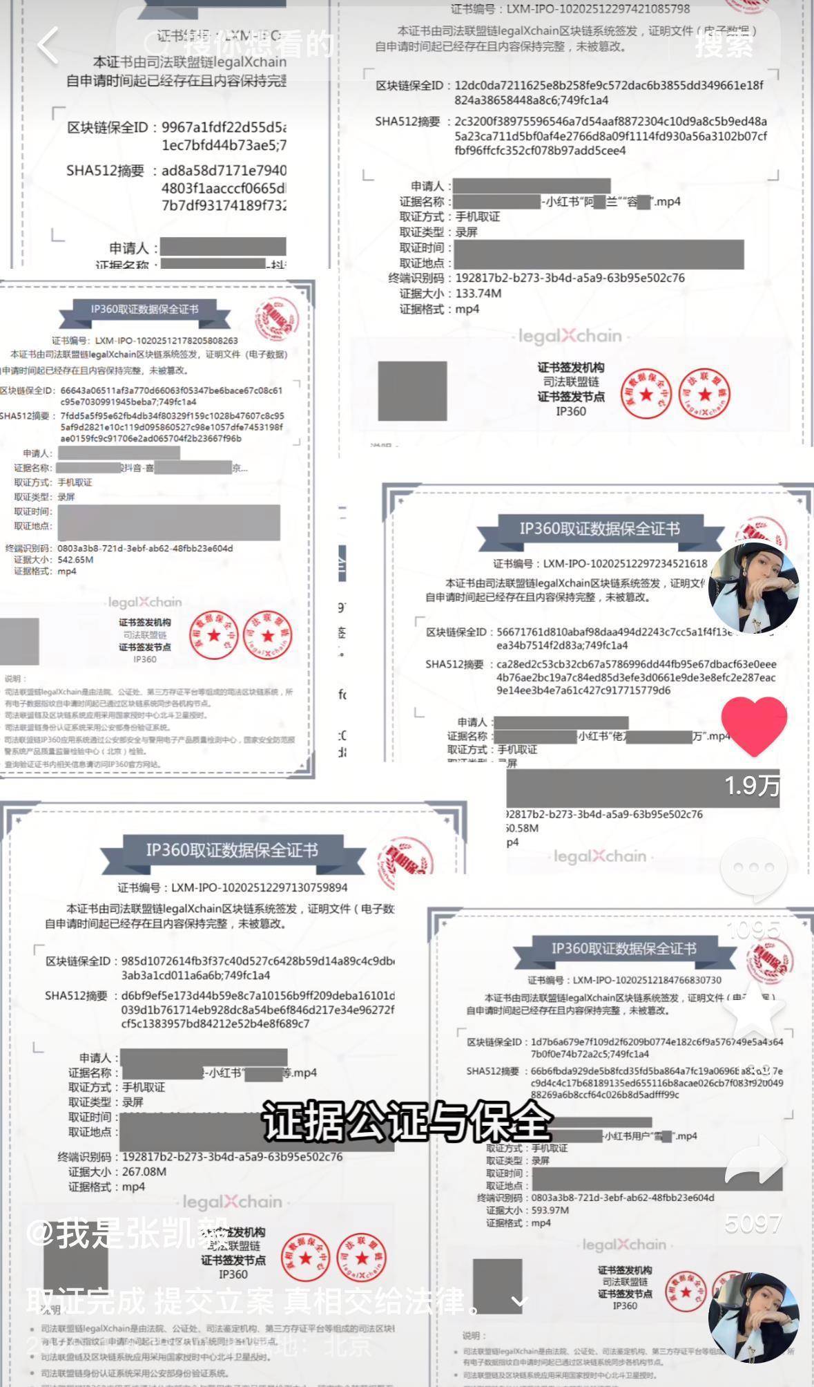 1月6日下午3时,张凯毅在事件风波后再次发布视频称,“近期网上有人将黄金凤冠事件加工成‘网暴开盒’‘假黄金’‘骗保’等一系列刑事罪名指控后,又借此事件继续造谣、诽谤我和家人。”她表示,目前已全部完成了对造谣证据的公证与保全,并正式向法院提起诉讼。张凯毅称,“真相不在口水里,在证据和法律文书里。”她还在视频末尾中表示,即日起将正式恢复更新。